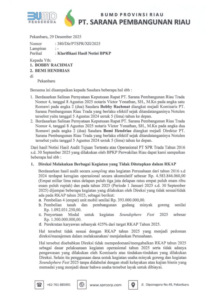 Temuan tersebut tertuang dalam surat klarifikasi PT Sarana Pembangunan Riau (Perseroda) tertanggal 29 Desember 2025.